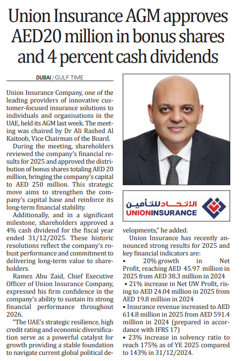 Board of Directors Recommends AED20 million in bonus shares and 4% cash dividendsUnion Insurance Company, one of the leading providers of innovative c…